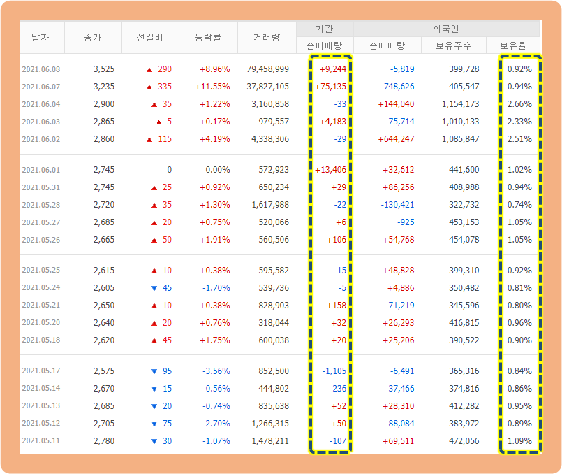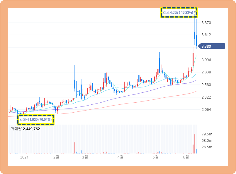 그리고 2021년 6월 8일에는 최고 4,035원까지 상승했었는데요. 아쉽게도 최고점 터치 후 바로 조정을 받으면서 현재는 3,380원까지 내려온 상황이네요.