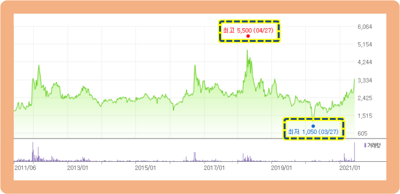 지난 10년 동안 광명전기의 주가 동향을 보시면, 최고점은 2018년 4월에 기록한 5,500원이였고 최저점은 2020년 3월에 기록한 1,050원이였습니다.