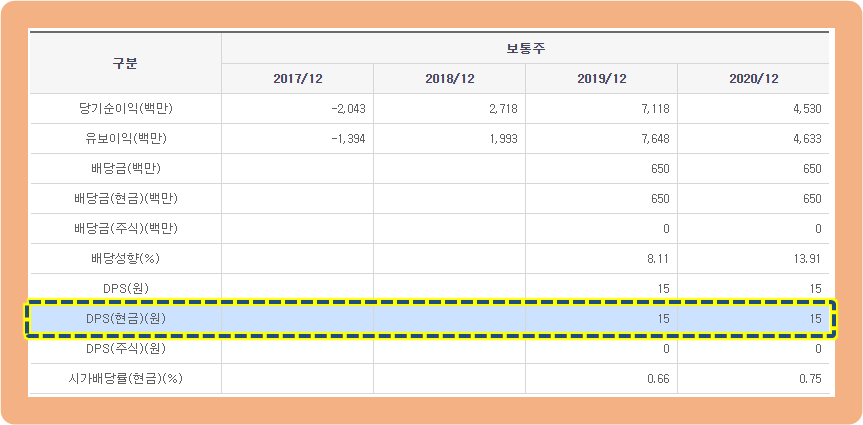 2019년과 2020년에는 주주분들에게 1주당 15원의 배당금을 지급해줬습니다.