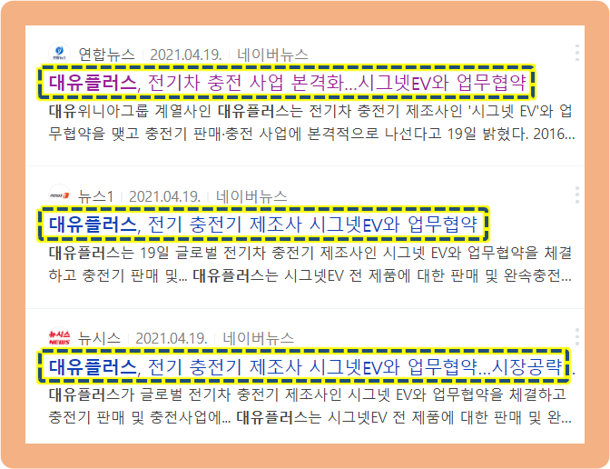 그리고 2021년 4월 19일, 대유플러스가 전기차 충전기 글로벌 제조 기업인 시그넷EV와 업무협약을 체결했다는 소식이 발표되었습니다.
