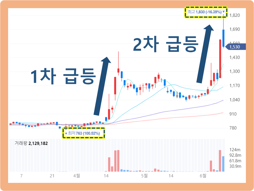 그리고 두 달 뒤인 2021년 6월 8일에 2차 급등이 시작되었으며, 6월 9일에는 최고점 1,830원까지 터치한 상황이네요.