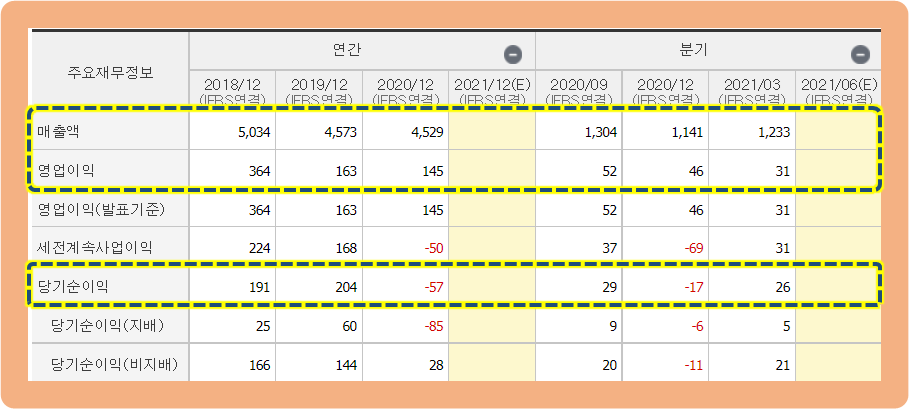 연간 당기순이익은 2020년도 기준으로 -57억원 손실을 기록하면서, 적자 전환된 상황이네요.