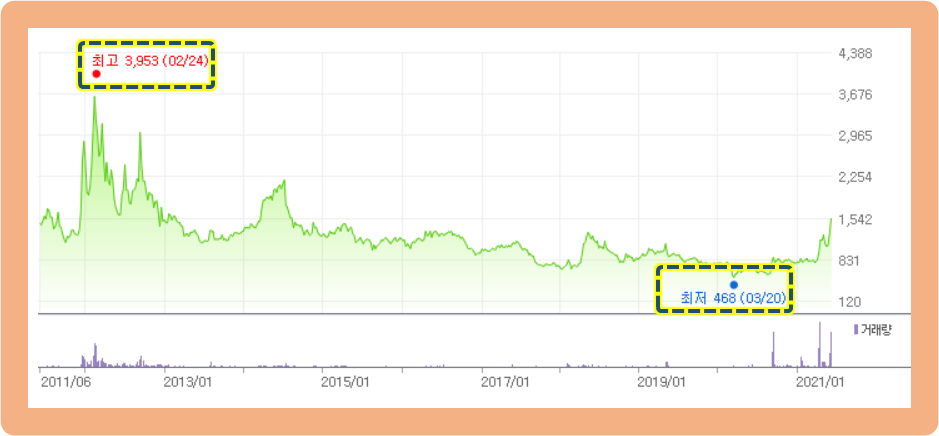 최고점은 2012년 2월에 기록한 3,953원이고, 최저점은 2020년 3월에 기록한 468원입니다.