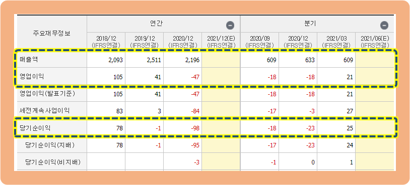 당기순이익도 2020년 기준으로 -98억원을 기록하면서, 전년도 대비 손실폭이 커졌으며 2년 연속 적자를 기록하고 있는 상황이네요.