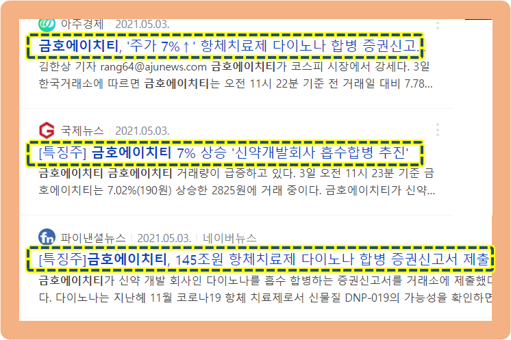 2021년 5월 3일, 금호에이치티가 다이노나를 흡수 합병하겠다는 증권신고서를 거래소에 제출했다는 소식이 전해졌는데요.
