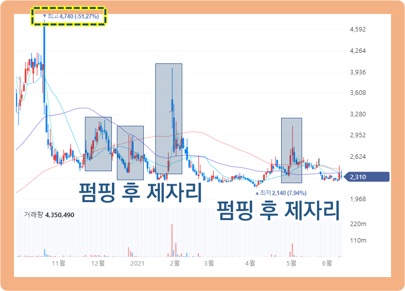 그리고 이후 주가는 여러 차례 펌핑이 있었는데요. 아쉽게도 일시적인 펌핑이였으며, 다시 위로 말아올리지는 못했죠