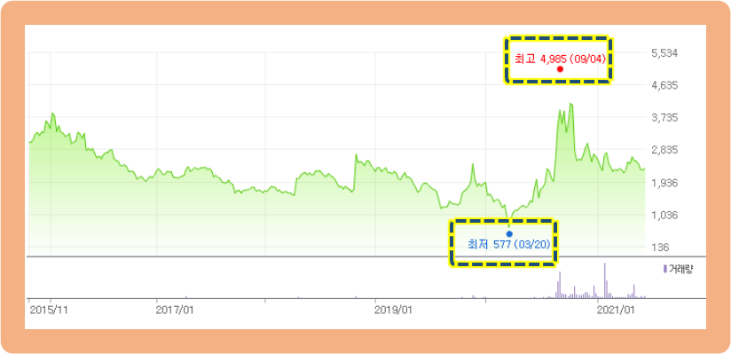 최저점은 2020년 3월에 기록한 577원이고, 최고점은 같은 해 9월에 기록한 4,985원입니다.