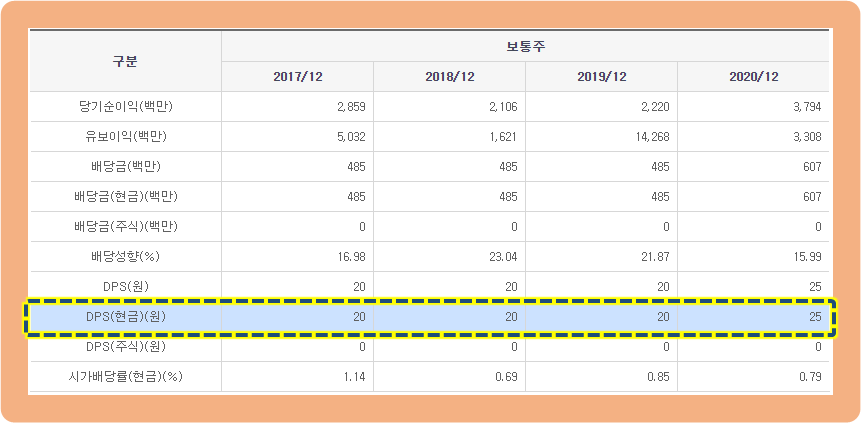 2017년도부터 2019년도까지는 1주당 배당금 20원을 지급해왔었는데요.