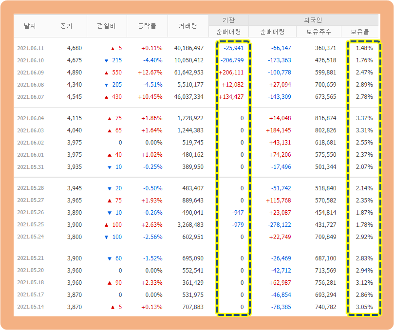 먼저 기관투자자의 경우를 보시면, 최근에 거래량이 갑자기 증가하였는데요.