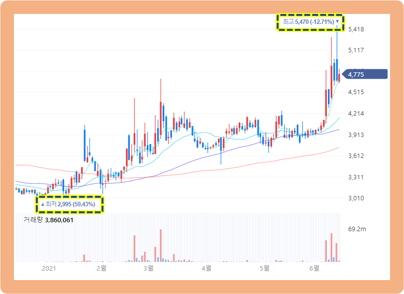 그리고 2021년 6월 11일에는 최고점 5,470원까지 터치한 상황이네요.