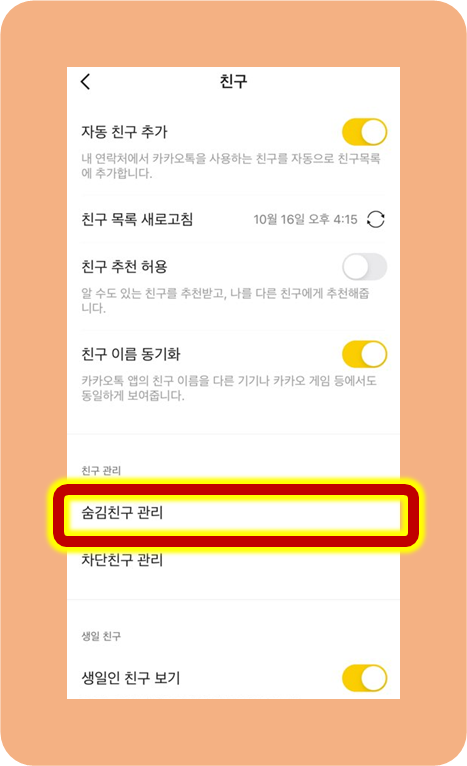 그 다음으로는 숨김친구 관리를 눌러주시면 돼요