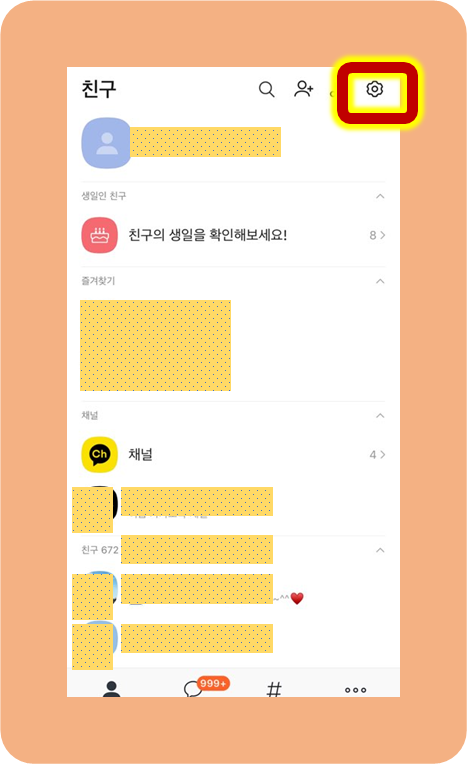 그럼 다시 카카오톡 홈 화면으로 돌아와서 오른쪽 위에 톱니바퀴모양의 설정을 눌러주세요