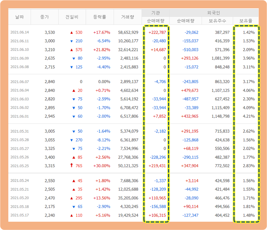 최근 기관투자자 및 외국인의 거래 추이를 살펴보겠습니다.
