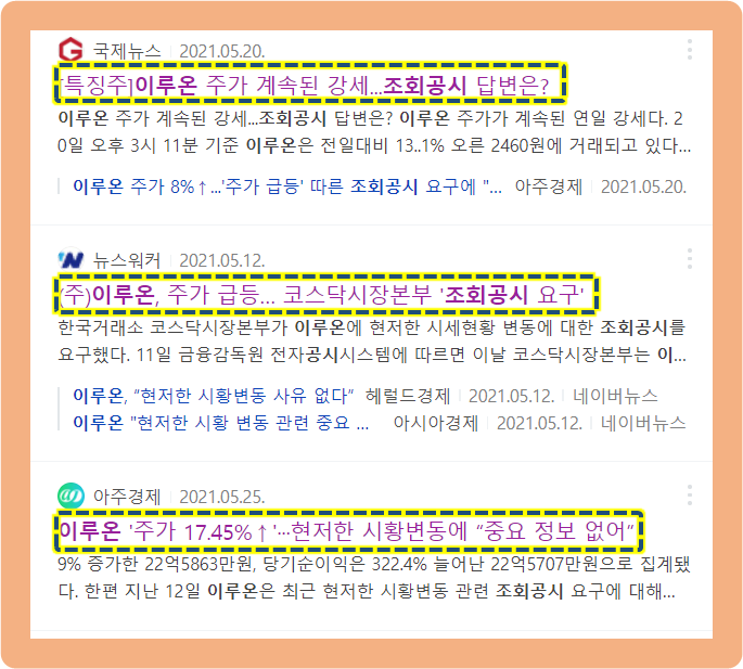 앞서 최근 주가 차트에서도 보셨듯이 이루온 주가는 5월 11일부터 상승하면서 연일 강세를 보였었는데요.