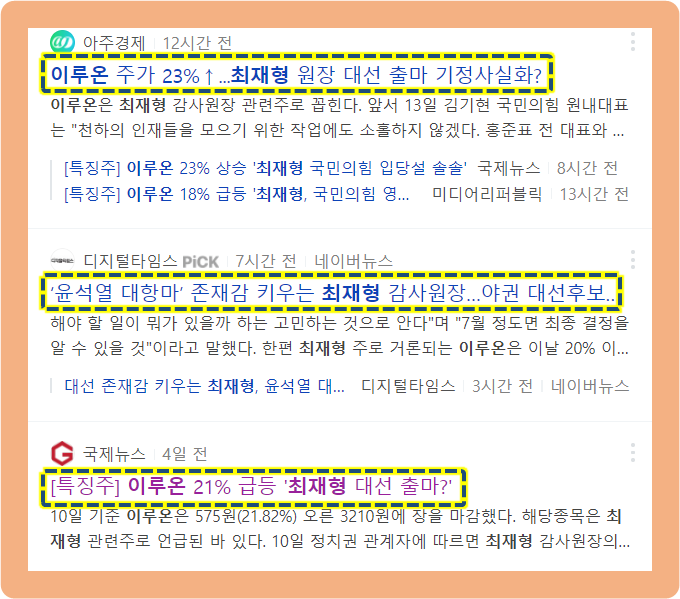 이루온의 이승구 대표님과 최재형 감사원장이 경기고등학교, 서울대학교 동문이라는 이유때문에 이루온은 최재형 관련주로 분류되고 있는데요.