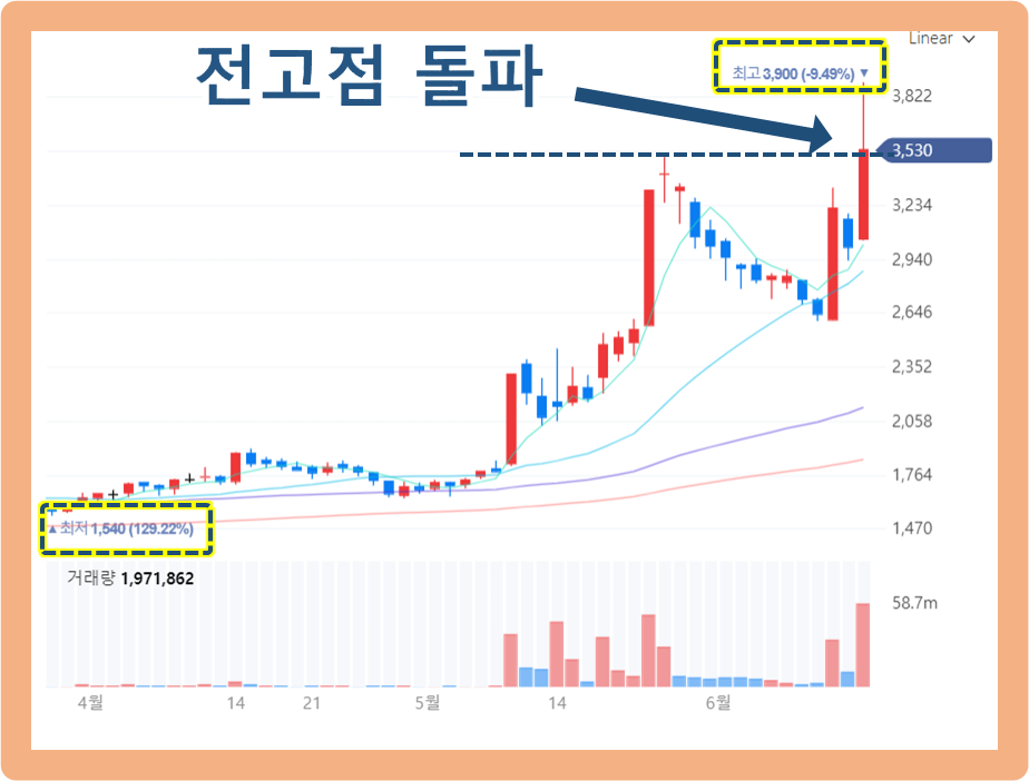 2021년 6월 10일에 주가가 다시 한 번 강세를 보이기 시작하더니, 6월 14일에는 직전 전고점을 돌파하면서 3,900원까지 터치한 상황입니다.