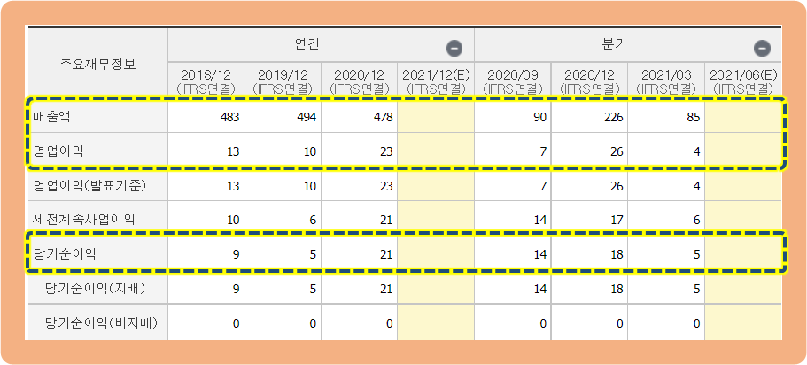 그리고 당기순이익은 2020년도 기준으로 21억원을 기록하면서, 전년도 5억원에 비해 무려 4배 이상 증가한 상황이네요.