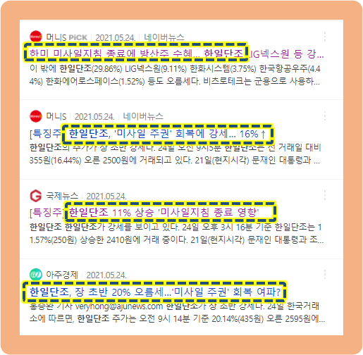 이 소식으로 인해 한일단조는 5월 21일부터 3거래일 동안 연속으로 각 약 4%, 11%, 23%씩 주가가 상승한 바 있으니 알아두시기 바랍니다.