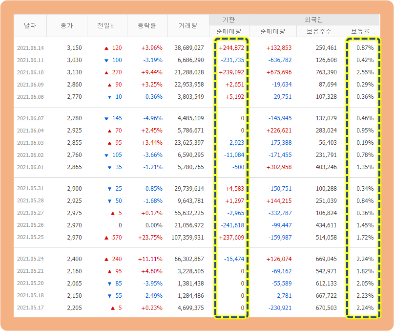 약 2주 뒤인 2021년 6월 8일부터 다시 주가가 급등했으며, 2021년 6월 14일에는 최고 3,435원까지 터치한 상황입니다.