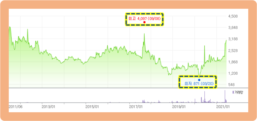 최고점은 2017년 9월에 기록한 4,097원이고, 최저점은 2020년 3월에 기록한 871원입니다.