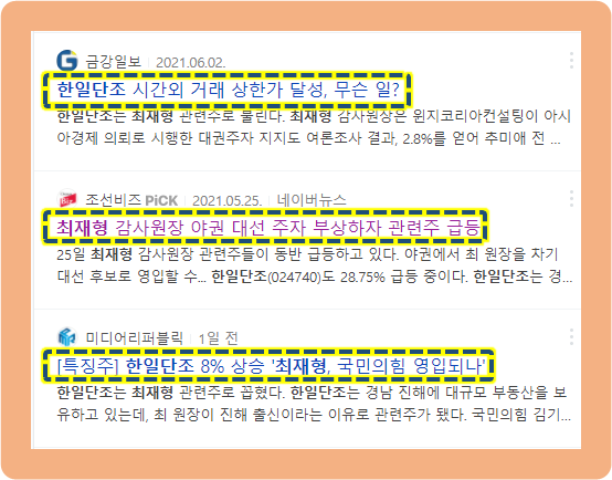 2021년 5월 말 이후 야권이 최재형 감사원장을 차기 대선 후보로 추진 중인 것이라는 것이 알려지면서 한일단조가 수혜를 받으며 투자자들의 관심을 받고 있는 상황입니다.