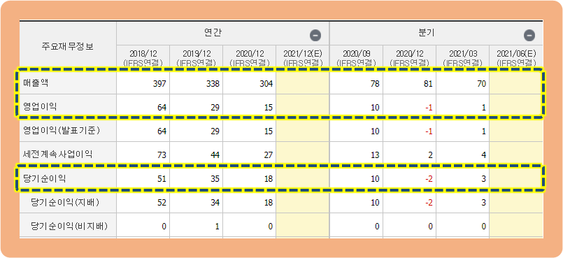 연간 당기순이익도 2020년도 기준으로 18억원을 기록하면서, 전년도 35억원 대비 반토막 수준입니다.