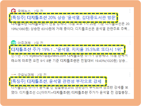 또한, 최근에는 디지틀조선이 과거 윤석열 전 총장이 서울중앙지검장 시절 조선일보 사장과 회동했었다는 이유로 윤석열 관련주로 주목받으면서 많은 투자자분들께 관심을 받고 있는 상황이죠.