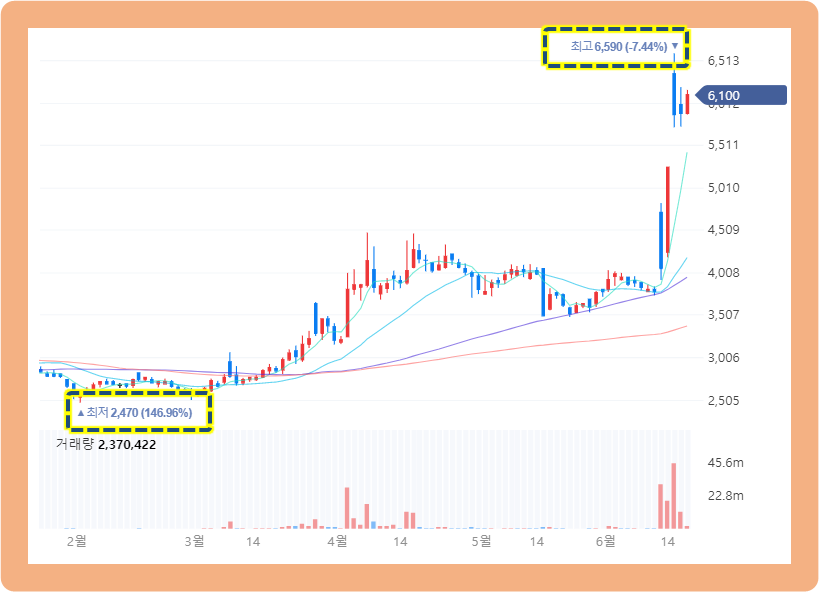 그러던 중 2021년 6월 11일에 주가가 갑자기 급등하기 시작하더니, 6월 15일에는 최고점 6,590원까지 터치한 상황입니다.