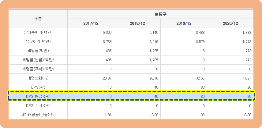 해마다 이익이 줄어들면서, 주식 배당금도 동반 하락하는 모습이네요.