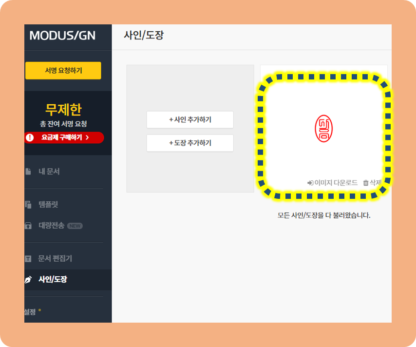 여기서 왼쪽 아래에 있는 사인/도장을 눌러주세요