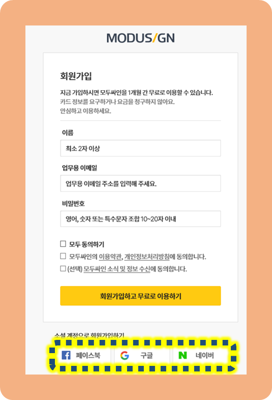 기존에 사용하시던 sns 소셜 아이디가 있으시다면 바로 가입을 진행 후 로그인할 수 있어요