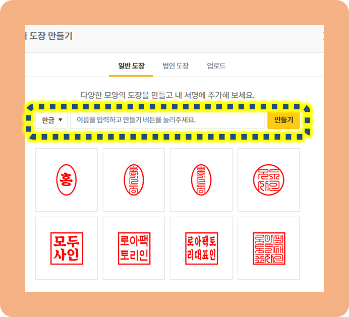 그럼 어떤 도장을 만들건지 단어를 쓰라는 창이 나오는데요