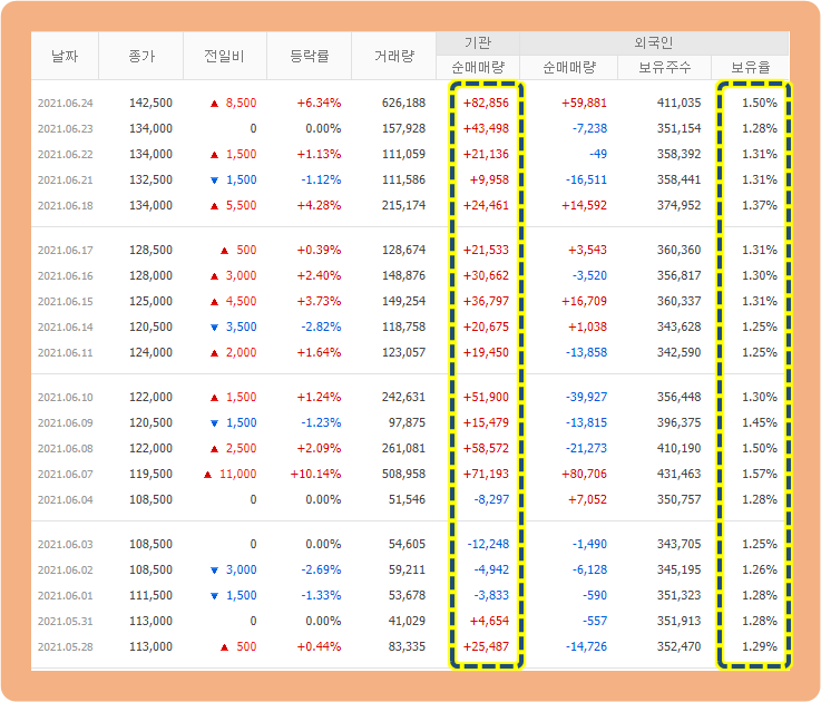 먼저 기관투자자의 경우를 보시면, 최근 죄다 빨간불이네요. 매수세가 급등하고 있습니다.