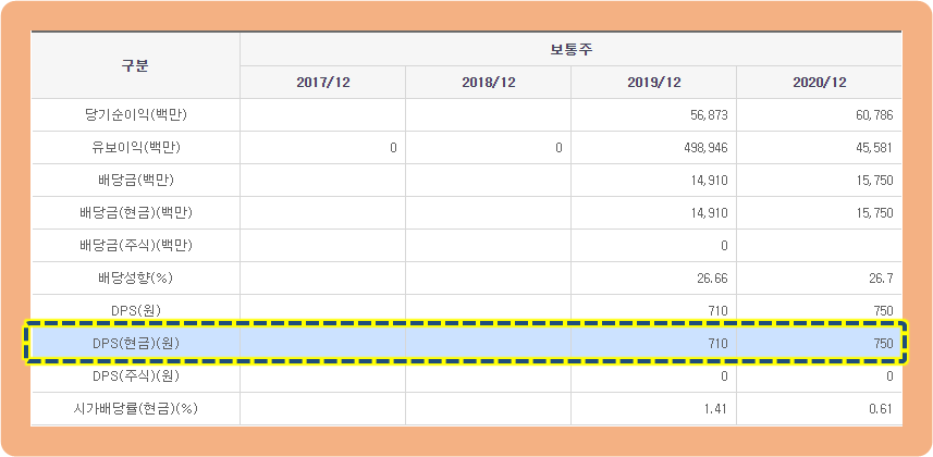2019년도에는 1주당 710원의 배당금을 지급해줬으며, 2020년도에는 1주당 750원의 배당금을 지급해줬습니다.