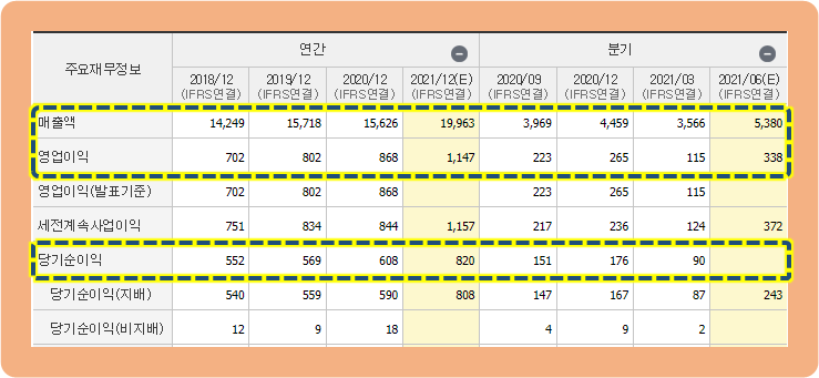 그리고 연간 영업이익은 2020년도 기준으로 868억원을 기록하면서, 전년도에 기록한 802억원 대비 66억원(약 8%) 상승했구요.