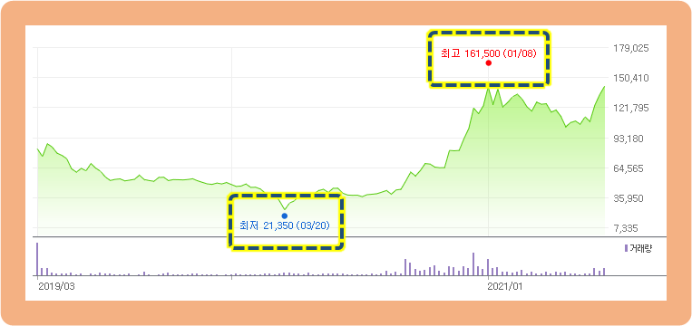 현대오토에버의 상장 이후 현재까지의 주가 추이를 보도록 하겠습니다. 최저가는 2020년 3월에 기록한 21,350원이고, 최고가는 2021년 1월에 기록한 161,500원으로 무려 8배 차이입니다.