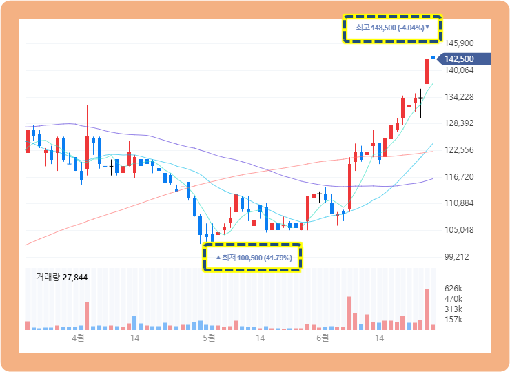 그리고 강세가 이어지면서 최근 6월 24일에는 최고 148,500원까지 터치한 상황이네요.
