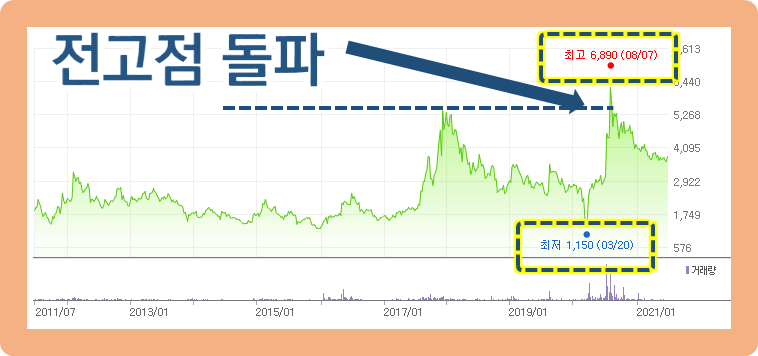 2020년 9월에 6,890원까지 터치하면서 최근 10년 내 전고점을 돌파했었네요. (물론 지금은 다시 조정을 받으면서 내려왔지만요.)