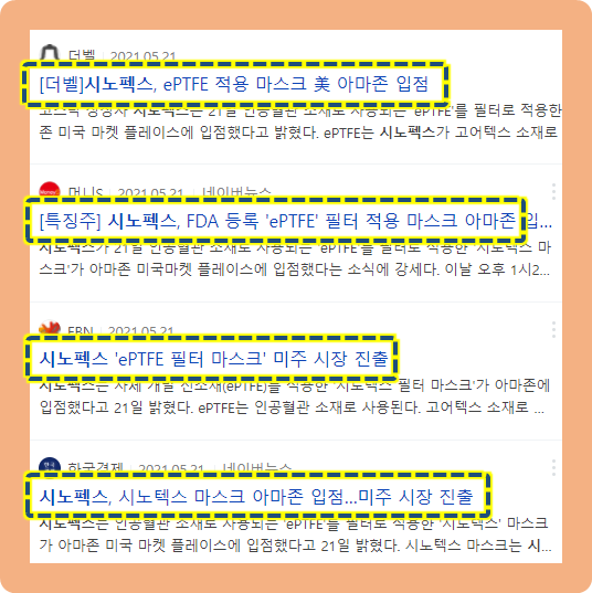 2021년 5월 21일, 시노펙스의 시노텍스 마스크가 미국 아마존 마켓 플레이스에 입점했다는 소식이 발표되었습니다.