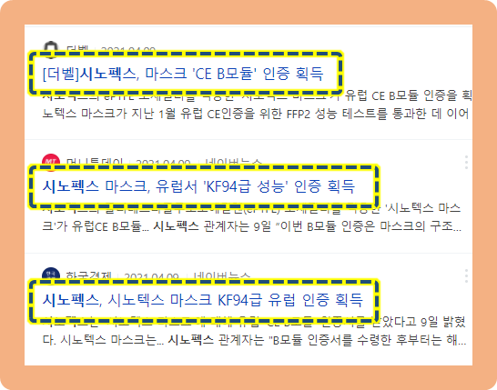 2021년 4월 9일, 시노펙스에서 ePTFE 소재필터를 적용시킨 "시노텍스 마스크"가 유럽 인증을 획득하였다는 소식이 발표되었습니다.