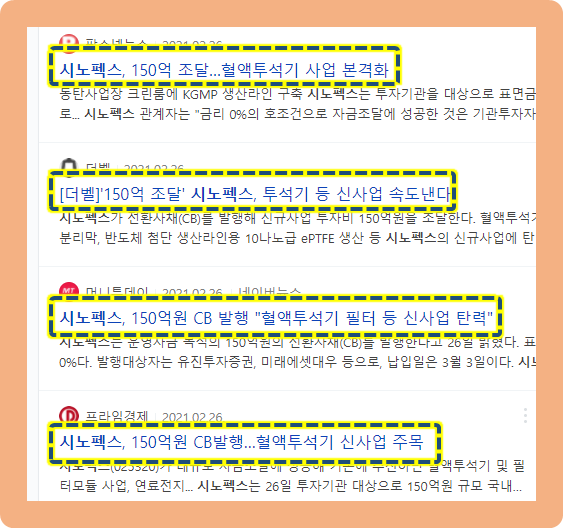 2021년 2월 26일, 시노펙스가 CB(전환사채) 발행을 통하여 약 150억원의 자금을 조달했다고 발표했습니다. 표면 및 5년 만기 금리는 0%이며, 이자를 지급하지 않는 조건이라고 합니다.