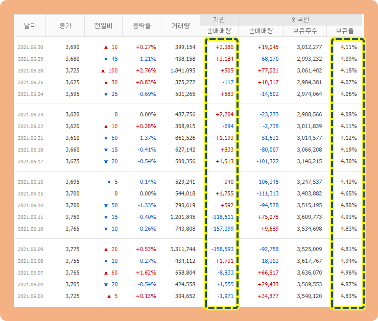 기관 투자자 및 외인 투자자 매매 동향