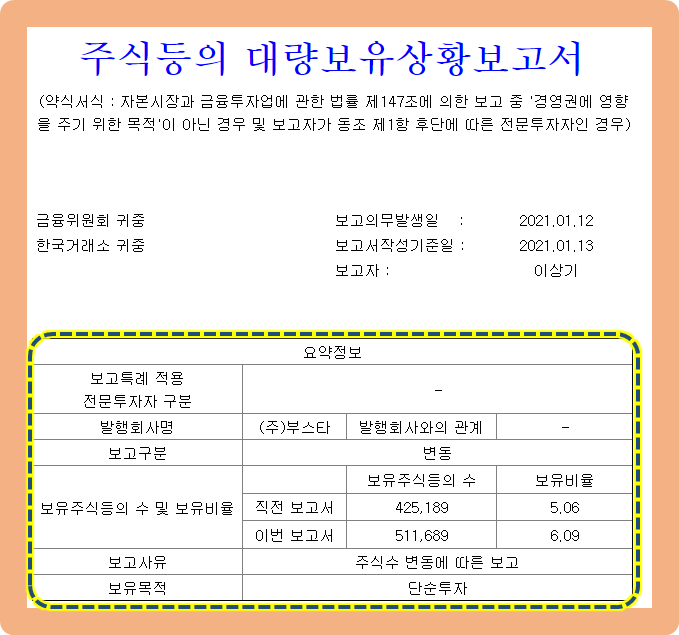 2021년 1월 13일, 슈퍼개미인 개인투자자 이상기씨가 부스타의 지분을 증가시켰다는 내용의 공시가 발표되었습니다.