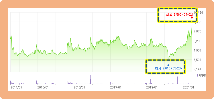 최저점은 2020년 3월에 기록한 2,815원이고, 최고점은 2021년 7월 2일에 기록한 9,560원입니다. 최근 에 기록한 최고가격이 지난 10년 동안의 가격 중 가장 높은 수준입니다.