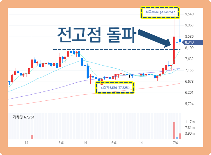 그리고 2021년 6월 30일에 주가가 갑자기 급등하는 모습을 보였는데요. 이 날 직전 전고점을 돌파해버리면서 9,560원까지 터치한 상황입니다.