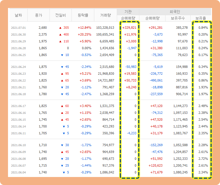 그리고 2021년 6월 30일부터 주가가 갑자기 급등하기 시작하더니, 7월 1일에는 최고 2,915원까지 터치한 상황이네요.
