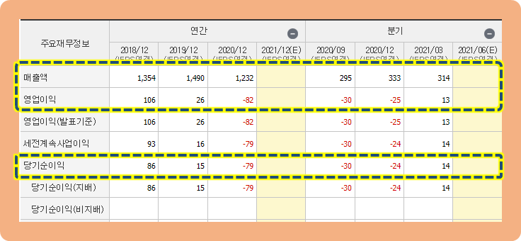 그래도 다행인건, 2021년 1분기의 영업이익과 당기순이익이 각 13억원, 14억원을 기록하면서 분기별 이익은 흑자로 전환되었네요.