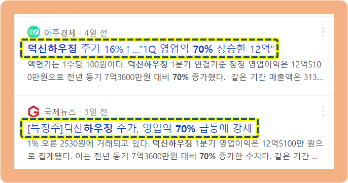 그리고 6월 30일, 덕신하우징의 1분기 잠정 영업이익이 약 12.5억원을 기록하면서 전년도 동기 대비 7억3600만원에 비해 무려 70% 증가했다는 소식이 발표되었습니다.