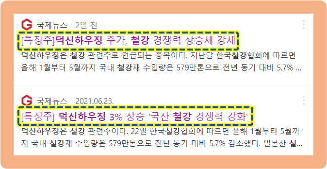 반면에 우리나라의 철강제품의 경쟁력은 높아지고 있다는 발표로 인해, 철강 관련주인 덕신하우징의 관심도가 높아진 상황이죠.