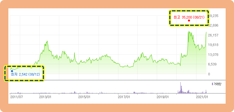 과거 10년 동안 바이오니아의 주가 변동 추이를 보도록 하겠습니다. 최저점은 2011년 8월에 기록한 2,542원이고, 최고점은 2020년 8월에 기록한 35,200원입니다.